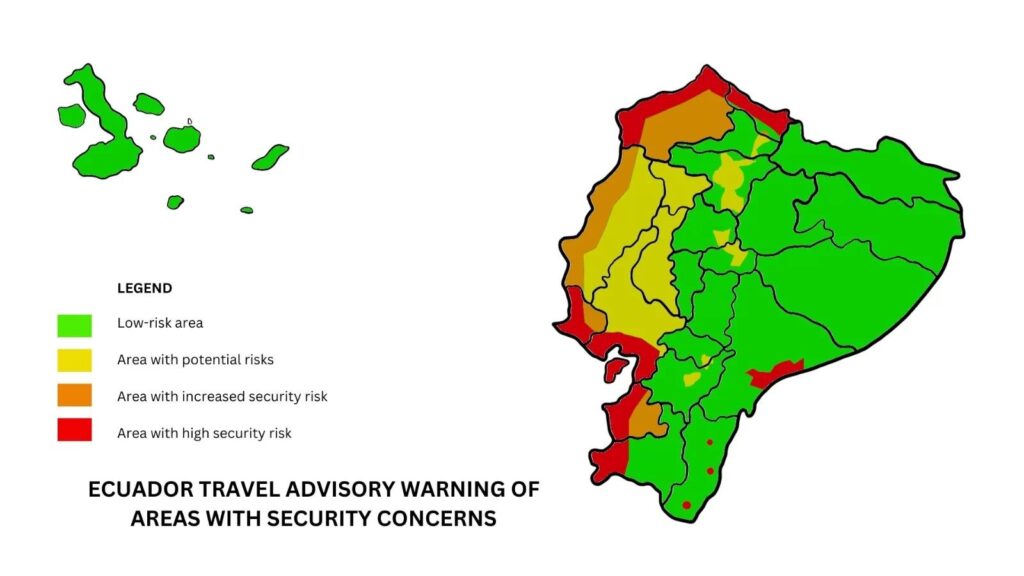 Ecuador alapvetően biztonságos ország, különösen a turistaövezetekben, azonban a világ más részeihez hasonlóan itt is előfordulnak zsebtolvajlások, különösen a nagyobb városok forgalmas területein vagy a tömegközlekedési eszközökön. Ezért érdemes értékeinket biztonságosan tárolni, nem kirakatba tenni az okostelefont, és kerüljük az ékszerek, órák viselését az utcán. A taxisofőrök között is akadnak csalók – mindig hivatalos taxit válasszunk. A vidéki területeken, különösen az Amazonas-medencében vagy a határvidékeken, csak megbízható szervezővel és vezetővel induljunk túrázni. A Galápagos-szigetek és a turistaközpontok jellemzően nagyon biztonságosnak számítanak. Quito és Guayaquil egyes kerületeiben éjszaka lehetőleg ne tartózkodjunk egyedül.